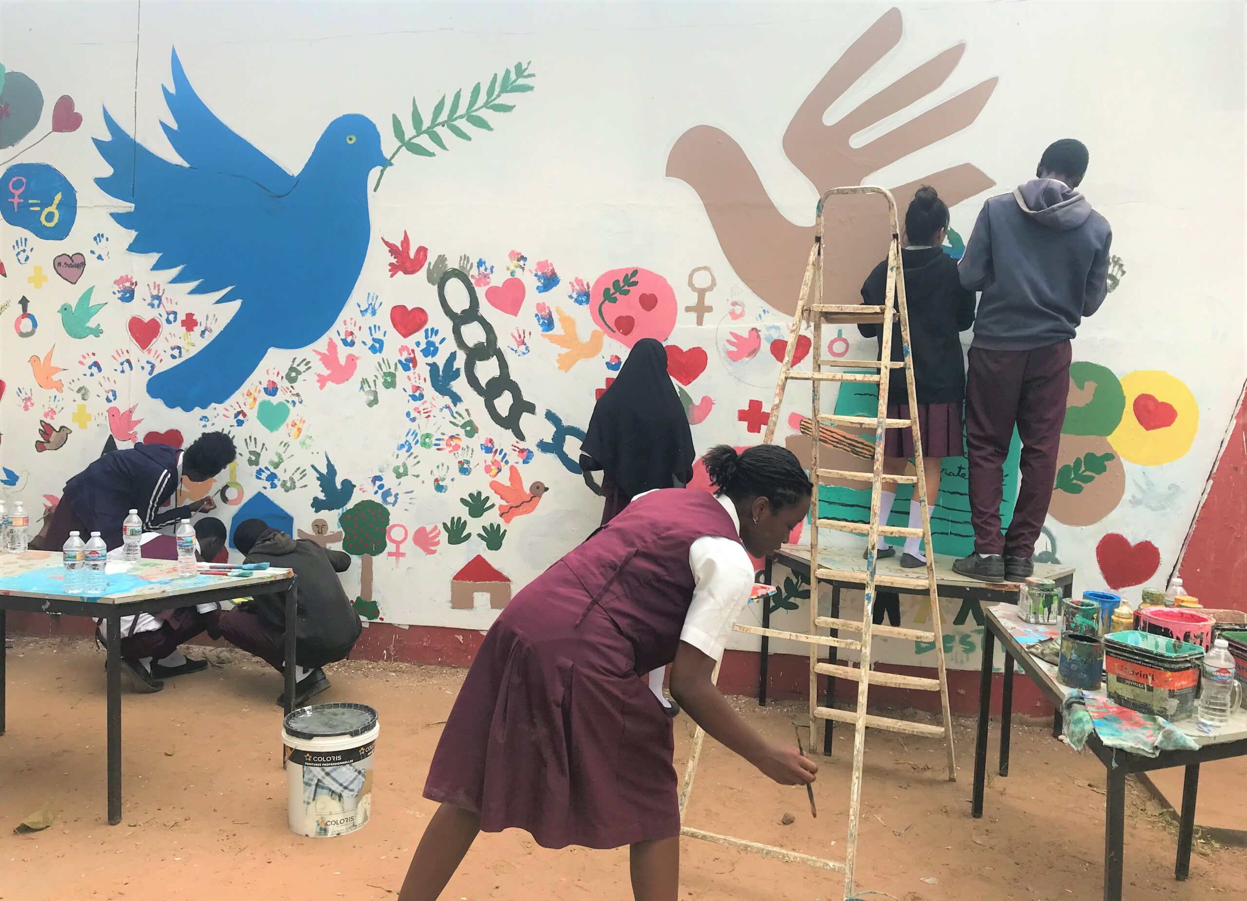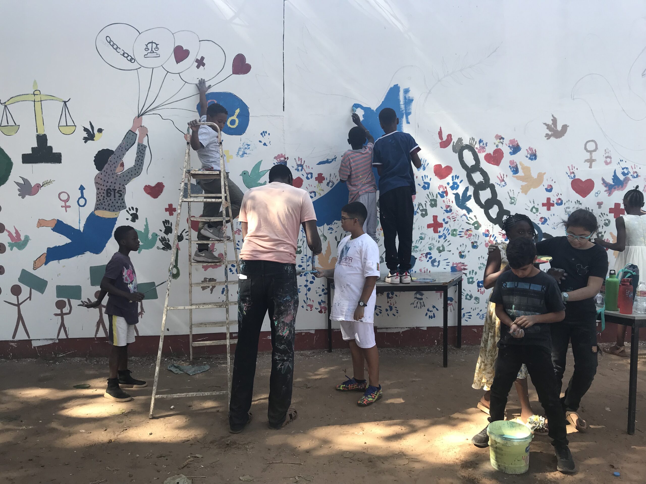 Firstly, the European Union funded the creation of a fresco on one of the outside walls of the Alliance by six classes from six different schools, with the support of the painter Moulaye. For six half-days, the schools took turns on the Alliance wall to create a work celebrating human rights and displaying several of their symbols on Kairaba Avenue. The following schools took part in creating the mural: SOS Children’s Village, Ecole Française de Banjul, Latrikunda Upper Basic School, SBEC International School, Diana Mariam International School and Cardinal Academy.