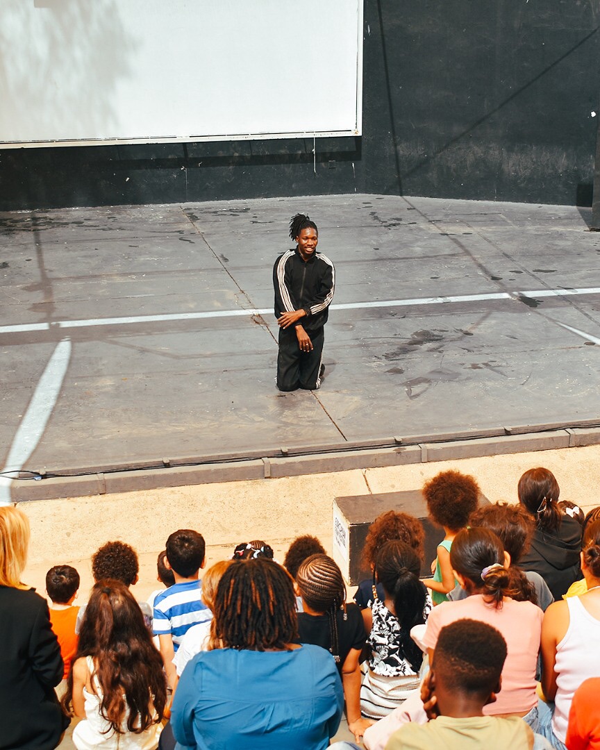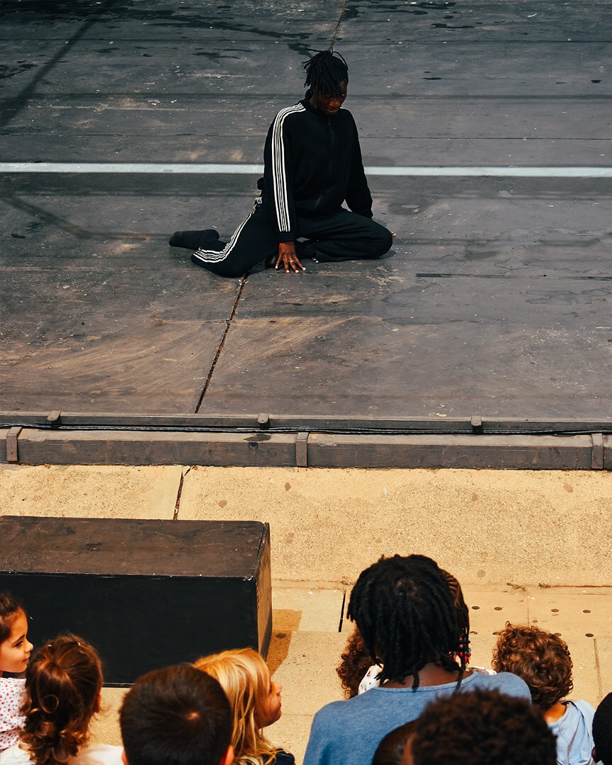 As part of the FESTHI Festival, two school workshops followed. After a short dance demonstration, Amadou guided students through the co-creation of short choreographic pieces, later performed on the Théâtre de Verdure (the open-air stage of the AFB).
