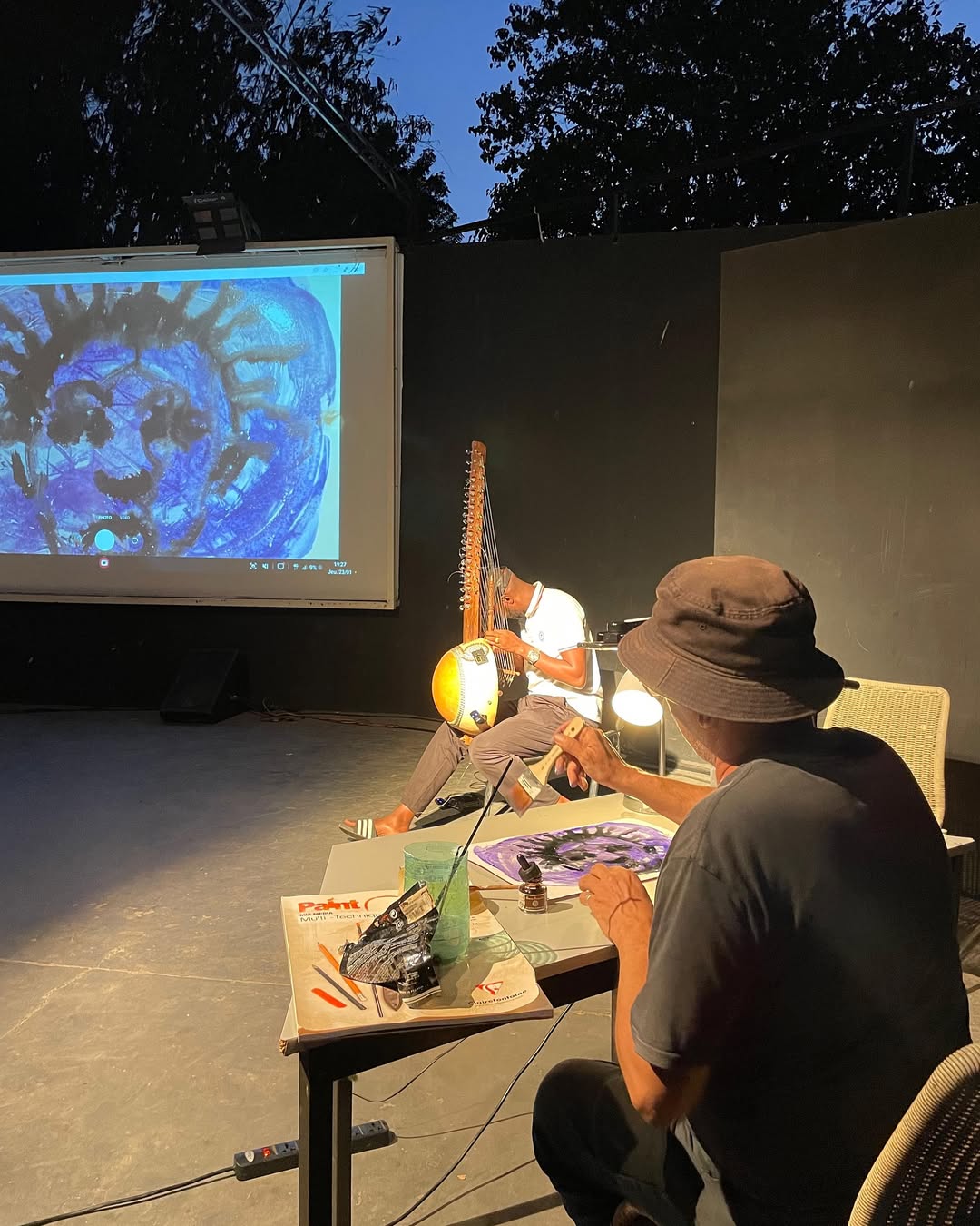 On January 24th, Patrick Singh took part in the drawn concert Soundscapes at the Alliance Française de Banjul. During this event, he created his artworks live, projected on a large screen, while Waagal played the handpan and Musa Suso performed on the kora, creating an enchanting musical atmosphere blending crystalline sounds and ancestral melodies.