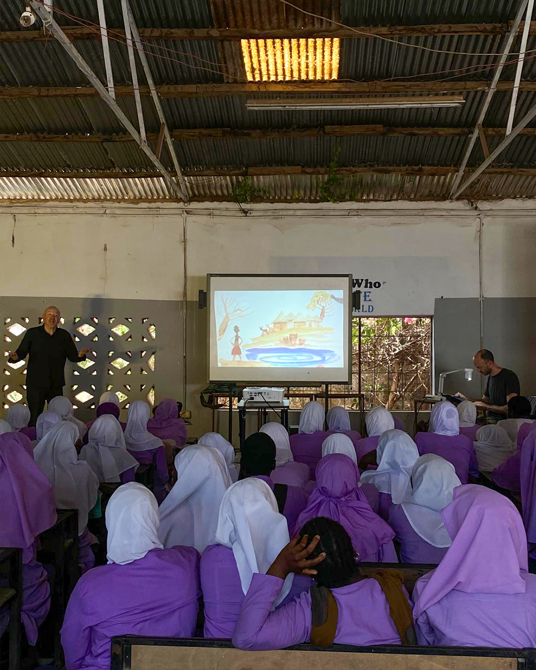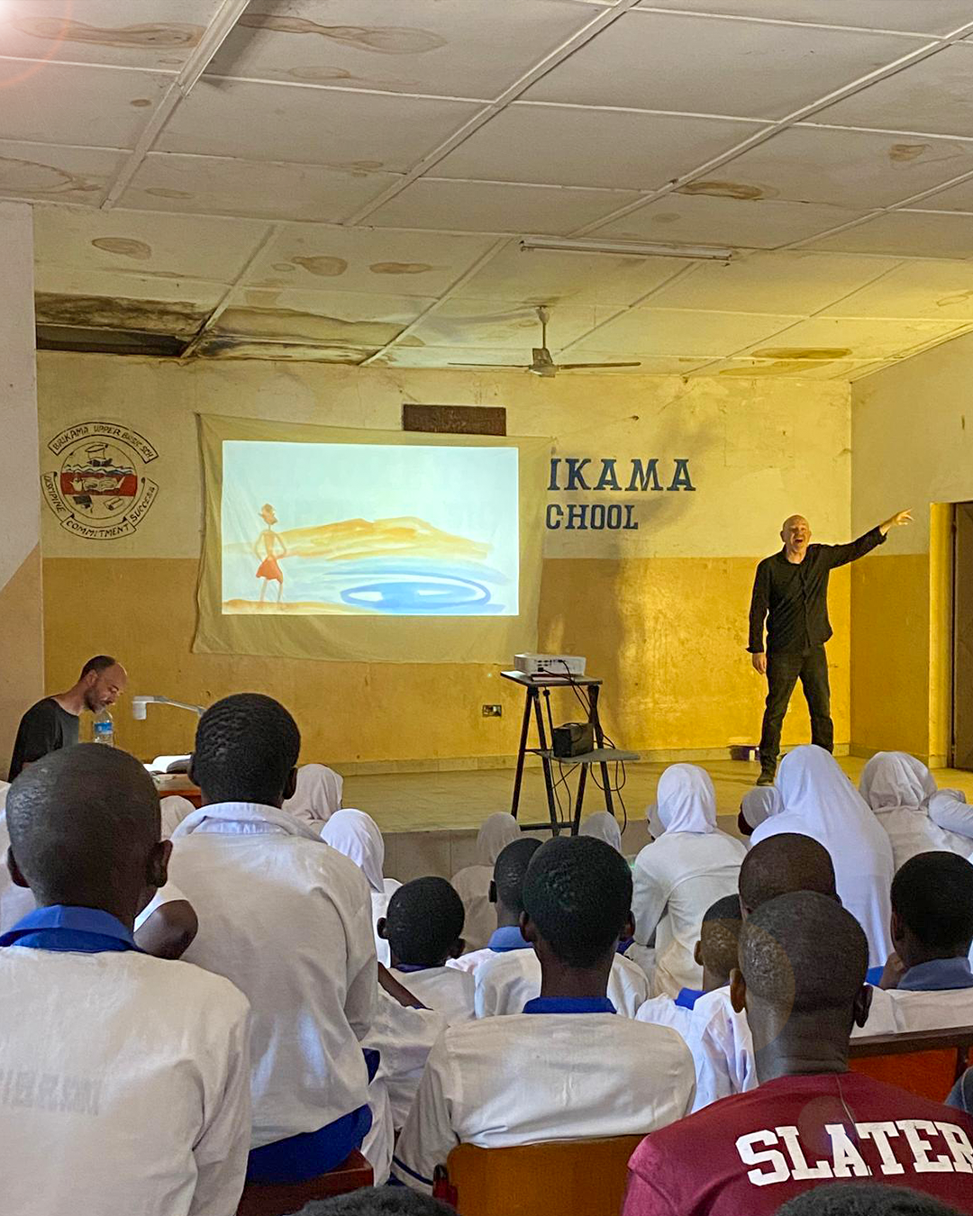 Richard Petitsigne et Fabian Grégoire ont fait voyager des centaines d’élèves pendant dix jours avec leur concept original : un conteur et un illustrateur qui travaillent ensemble en live. Richard raconte, Fabian dessine à l’aquarelle au fur et à mesure.