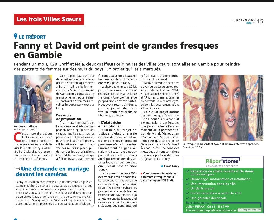 L’impact de cette résidence a dépassé les frontières gambiennes : le journal régional « Les Trois Villes Sœurs » en France a publié un article dédié au travail de K2B et Naja en Gambie. Cette reconnaissance témoigne de la portée de leur projet, qui allie engagement artistique et message social fort.